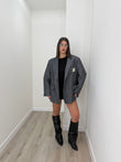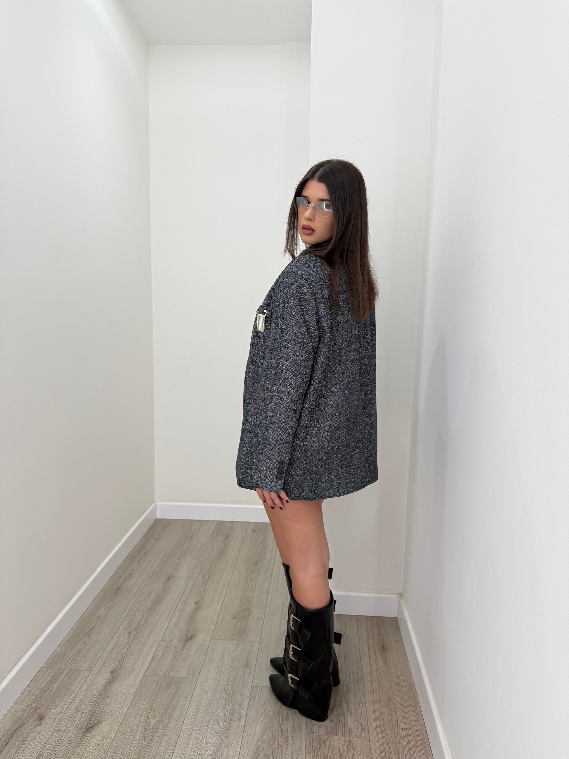 Blazer over e laminato by lumina, veste fino ad una XL. Porta le spalline imbottite e spilla sul taschino.
