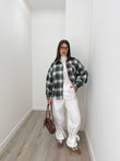Camicia over con spalline imbottite e maniche larghe, veste fino ad una L abbondante. Abbinata al pantalone by lumina e maglia jessica