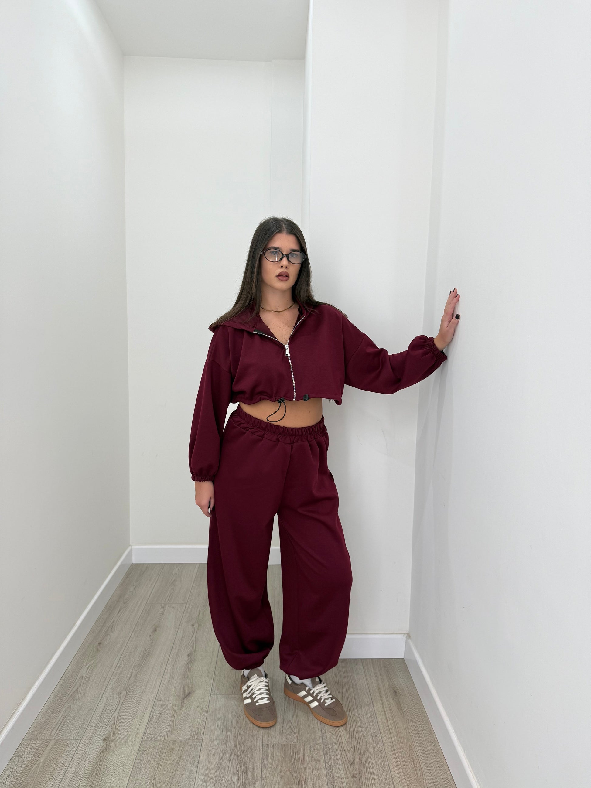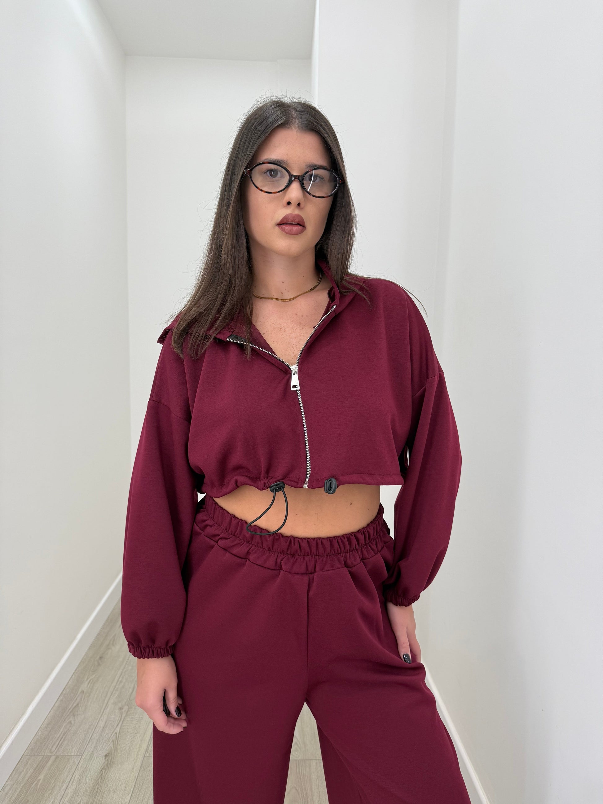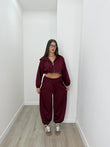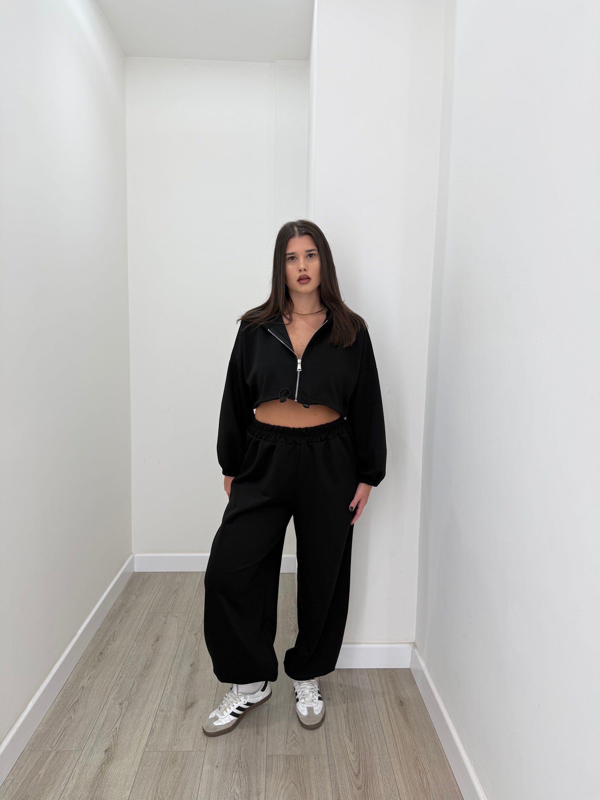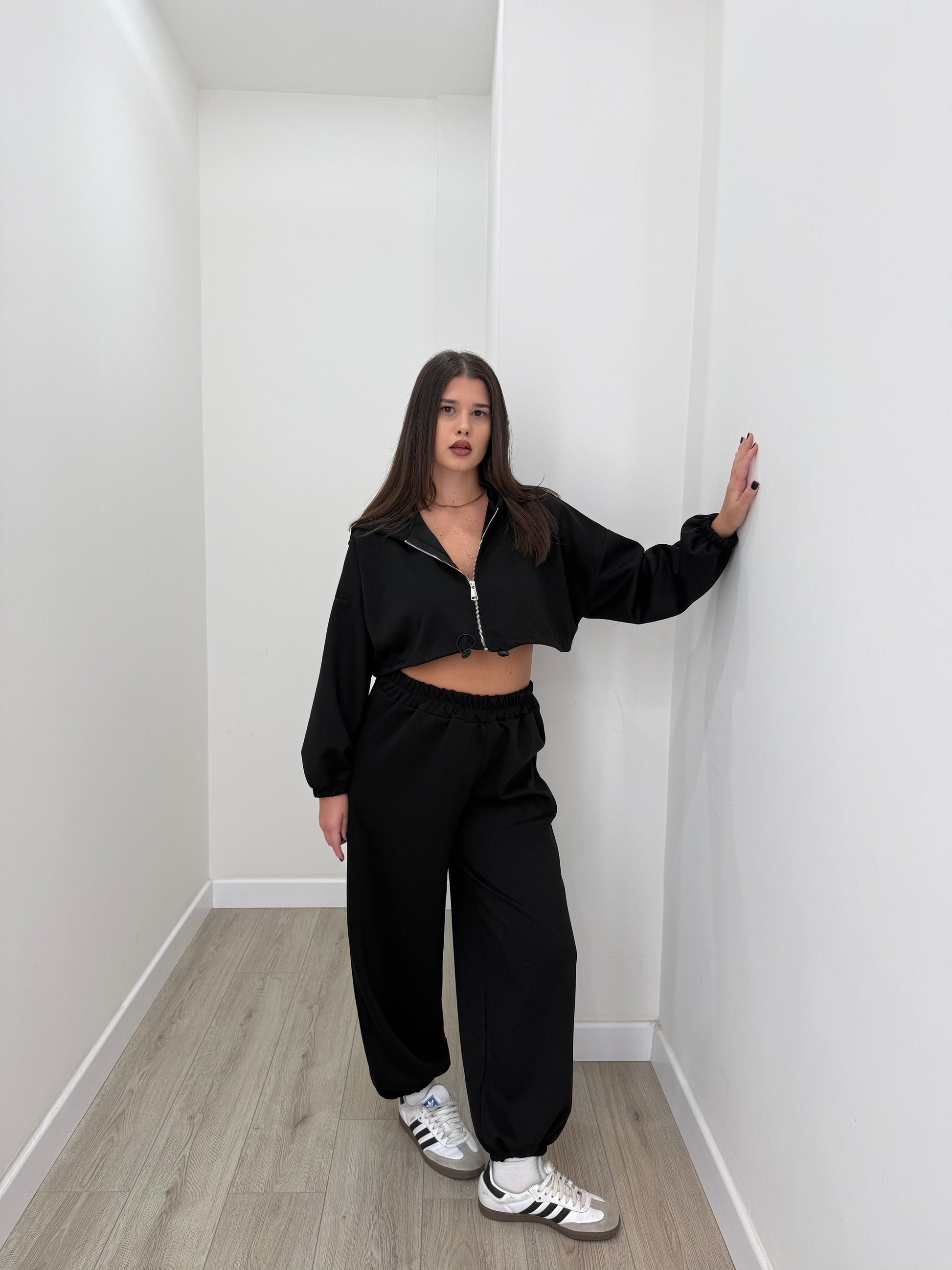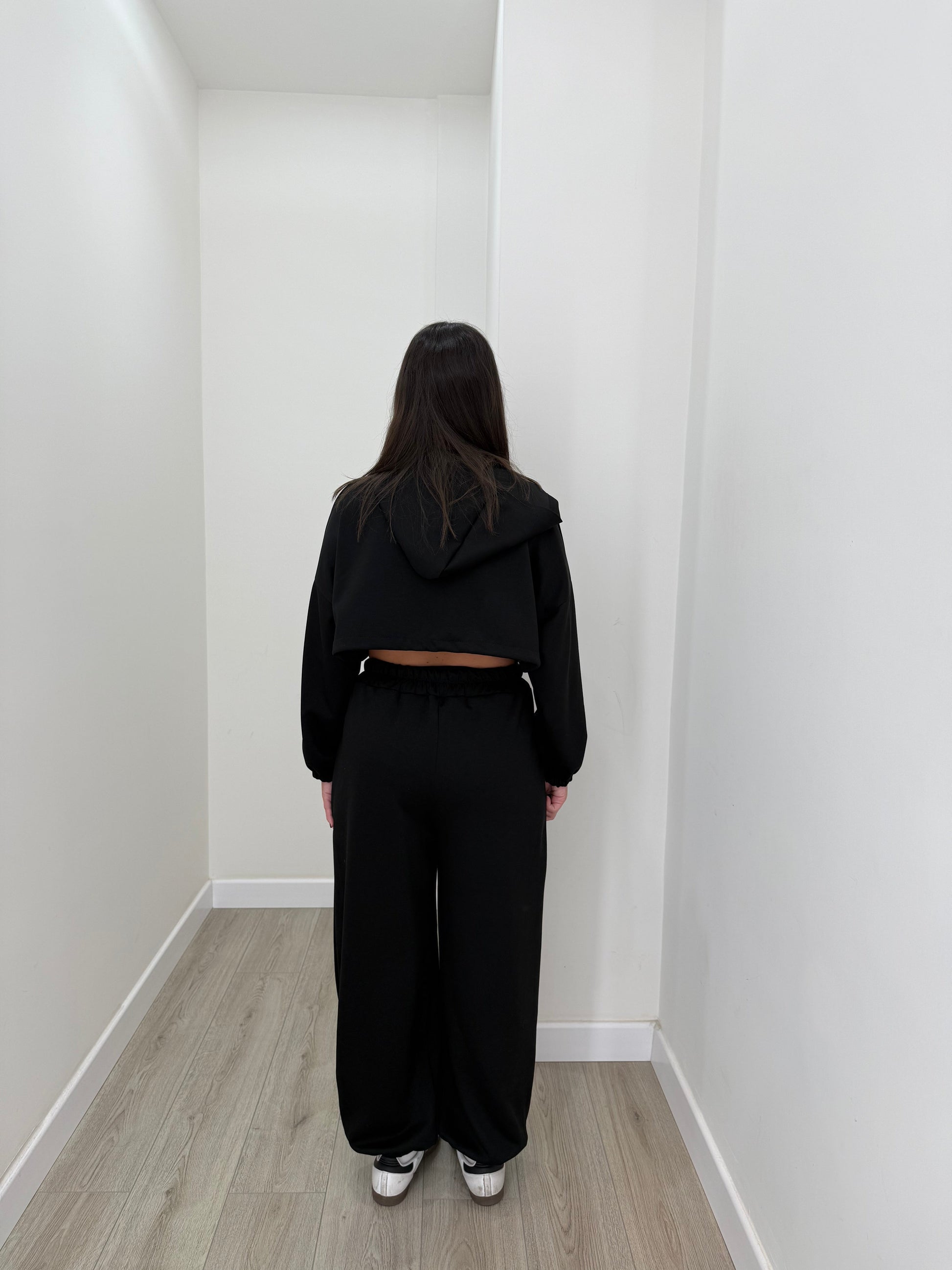 Coordinato tuta morbido formato da pantalone elasticizzato, veste fino ad una XL, con elastico sul fondo e felpa crop. La felpa ha la zip e cappuccio e elastico sul polsino.