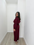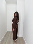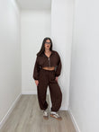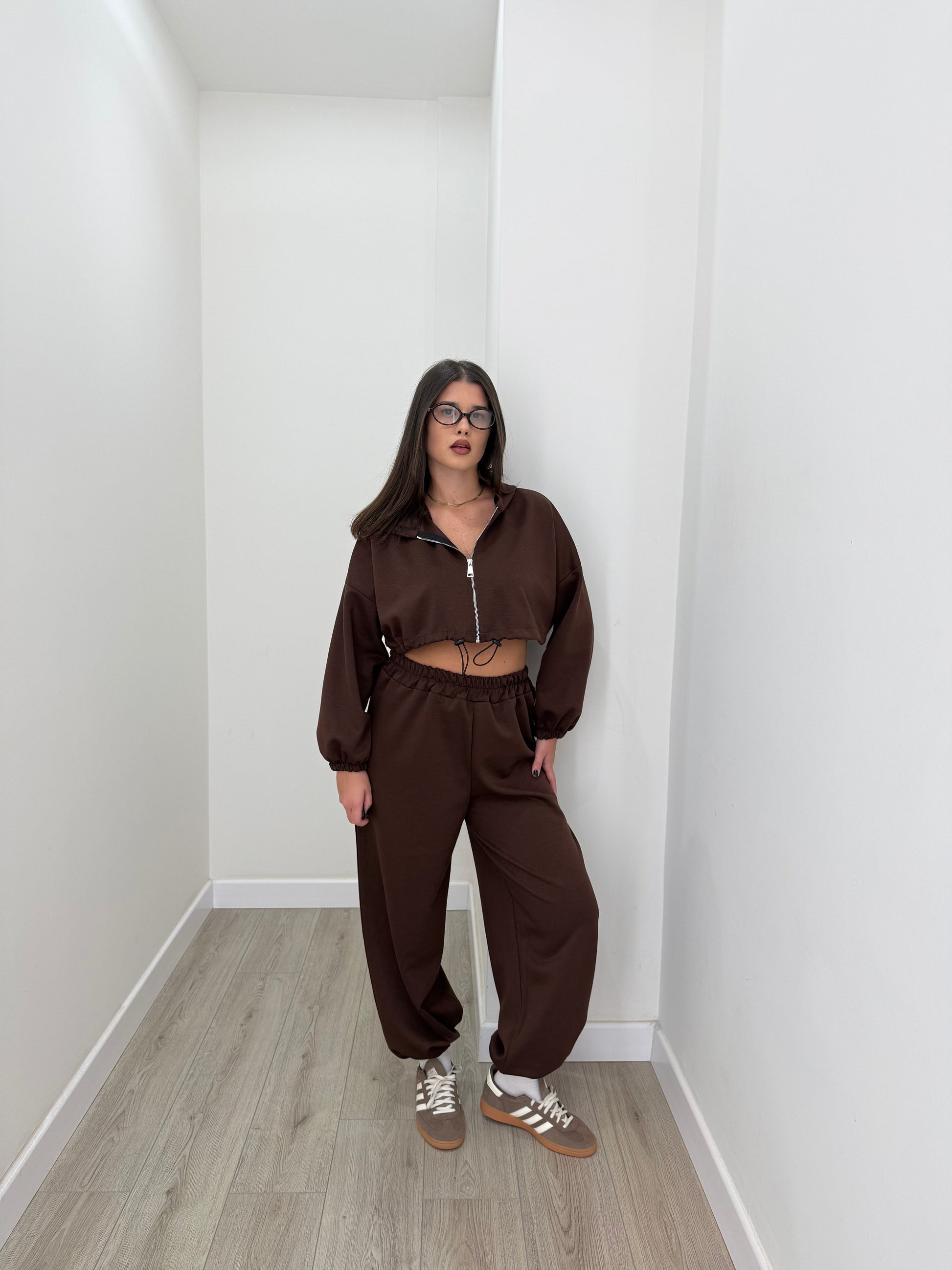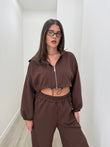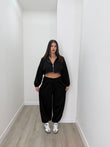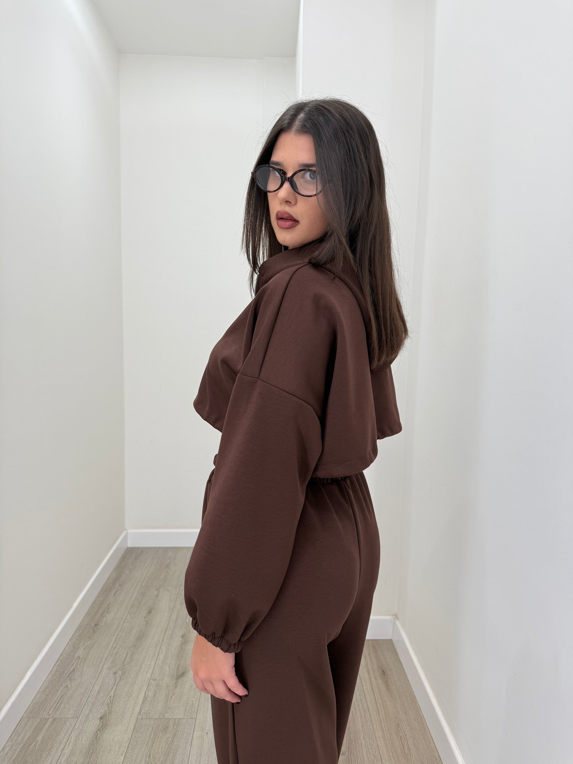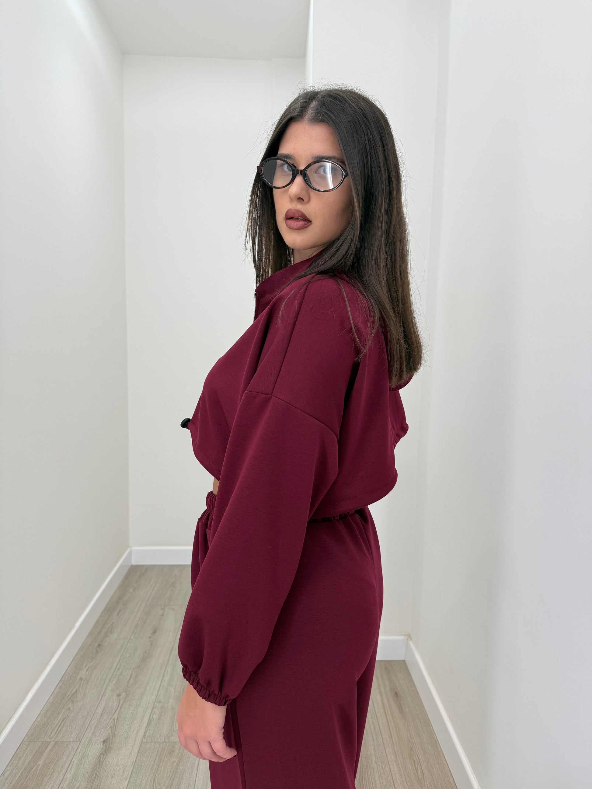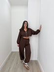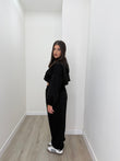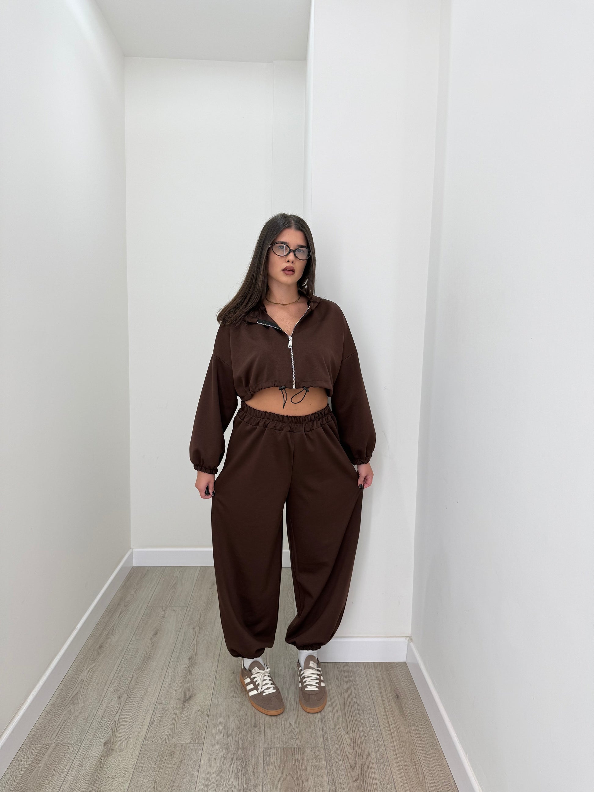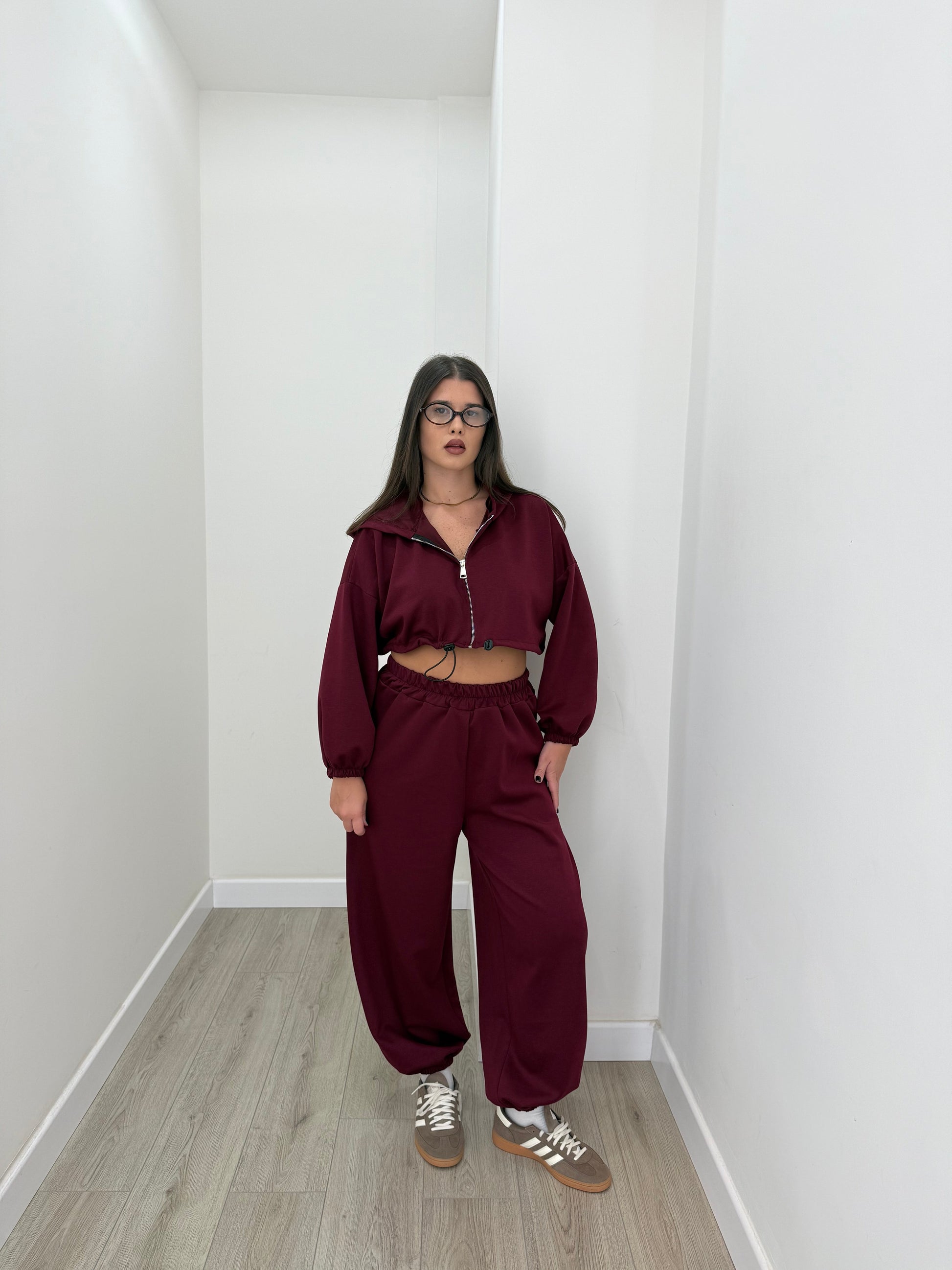 Coordinato tuta morbido formato da pantalone elasticizzato, veste fino ad una XL, con elastico sul fondo e felpa crop. La felpa ha la zip e cappuccio e elastico sul polsino.