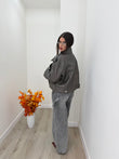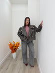 Giacca in pelle over, veste fino ad una XL, chiusura con cerniera. Abbinata alla maglia nicole e jeans wide leg, indosso tg.M