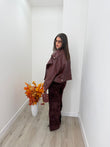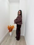 Pantalone in camoscio con il dettaglio degli intrecci regolabili con laccio. Roberta indossa taglia L. Abbinato alla camicia lucy e jacket Urban bordeaux