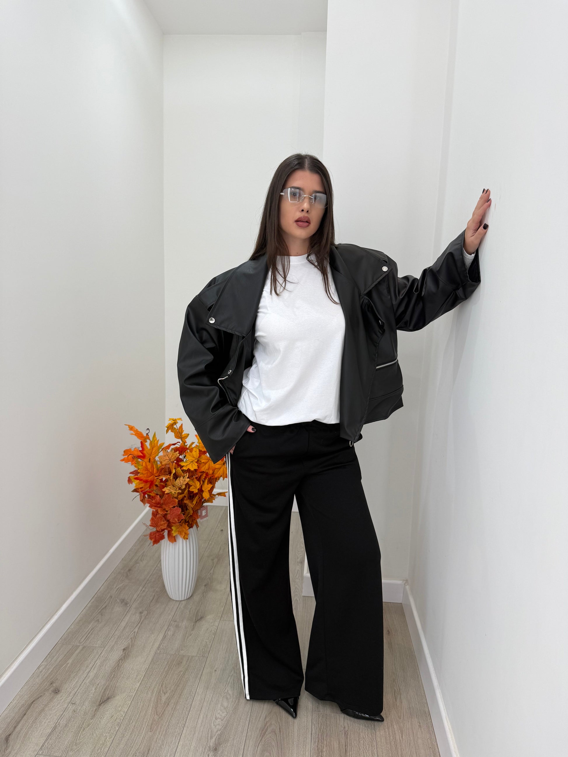 Pantalone di tuta morbido, con doppia riga in entrambi i lati. Con elastico in vita, veste fino ad una L abbondante. Il pantalone è caldo. Abbinato alla maglia over size e jacket urban variante nera