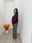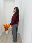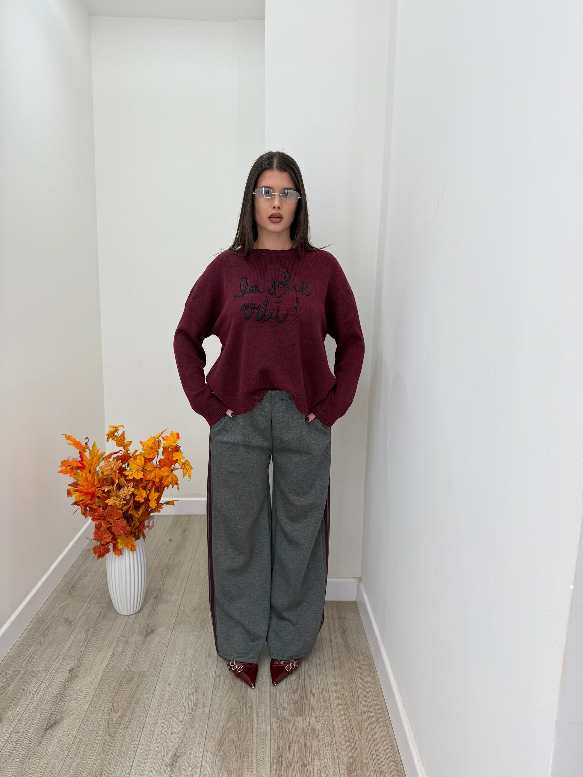 Pantalone di tuta morbido, con doppia riga in entrambi i lati. Con elastico in vita, veste fino ad una L abbondante. Il pantalone è caldo. Abbinato al maglione dolce vita variante bordeaux