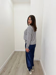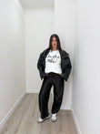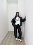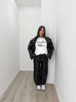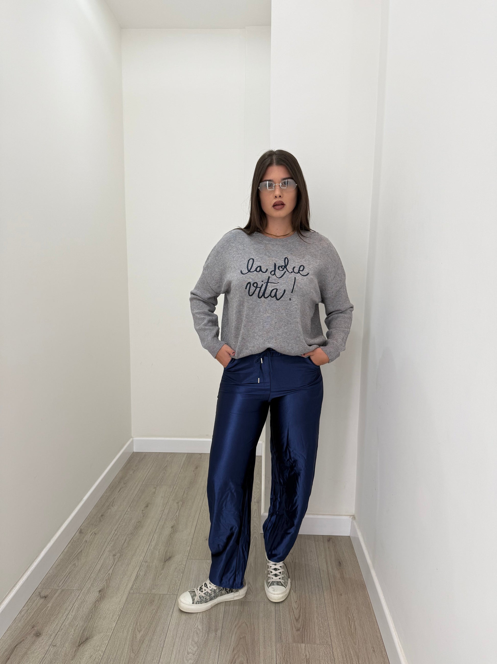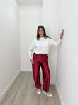 Pantalone elasticizzato effetto lucido, con elastico in vita e laccio. Veste fino ad una L abbondante