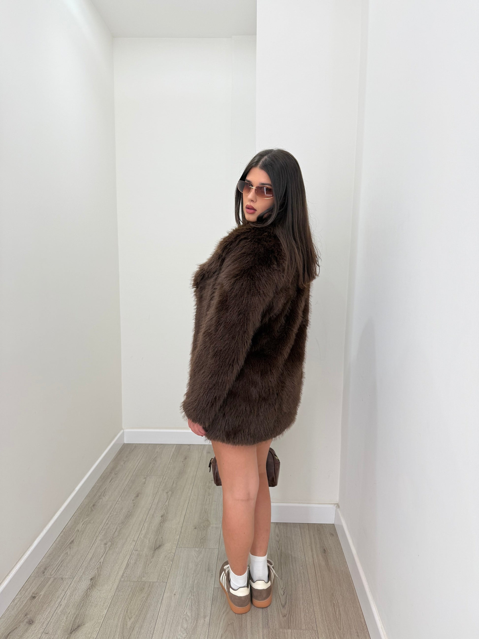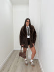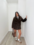 Pelliccia over super calda e morbida. Con tasche laterali e chiusura con doppio bottone. Veste fino ad una L abbondante. Abbinata alla culotte keira e la camicia iris