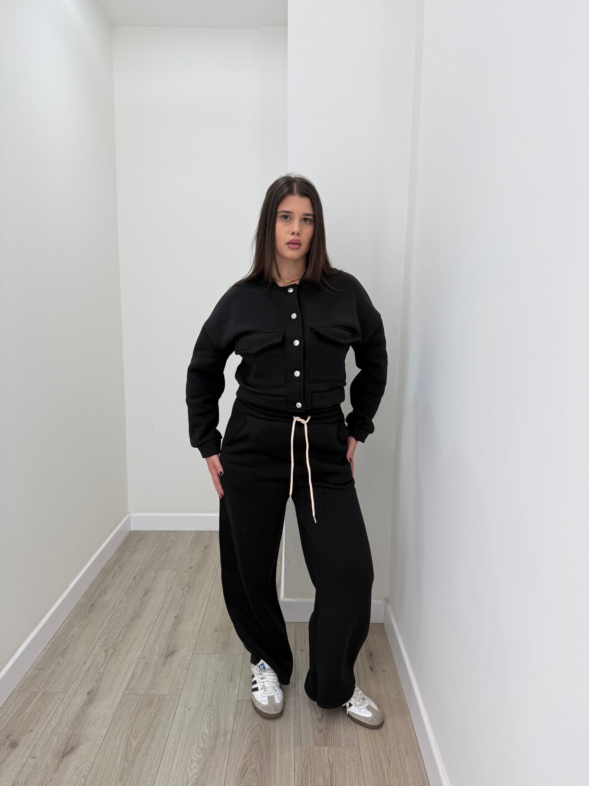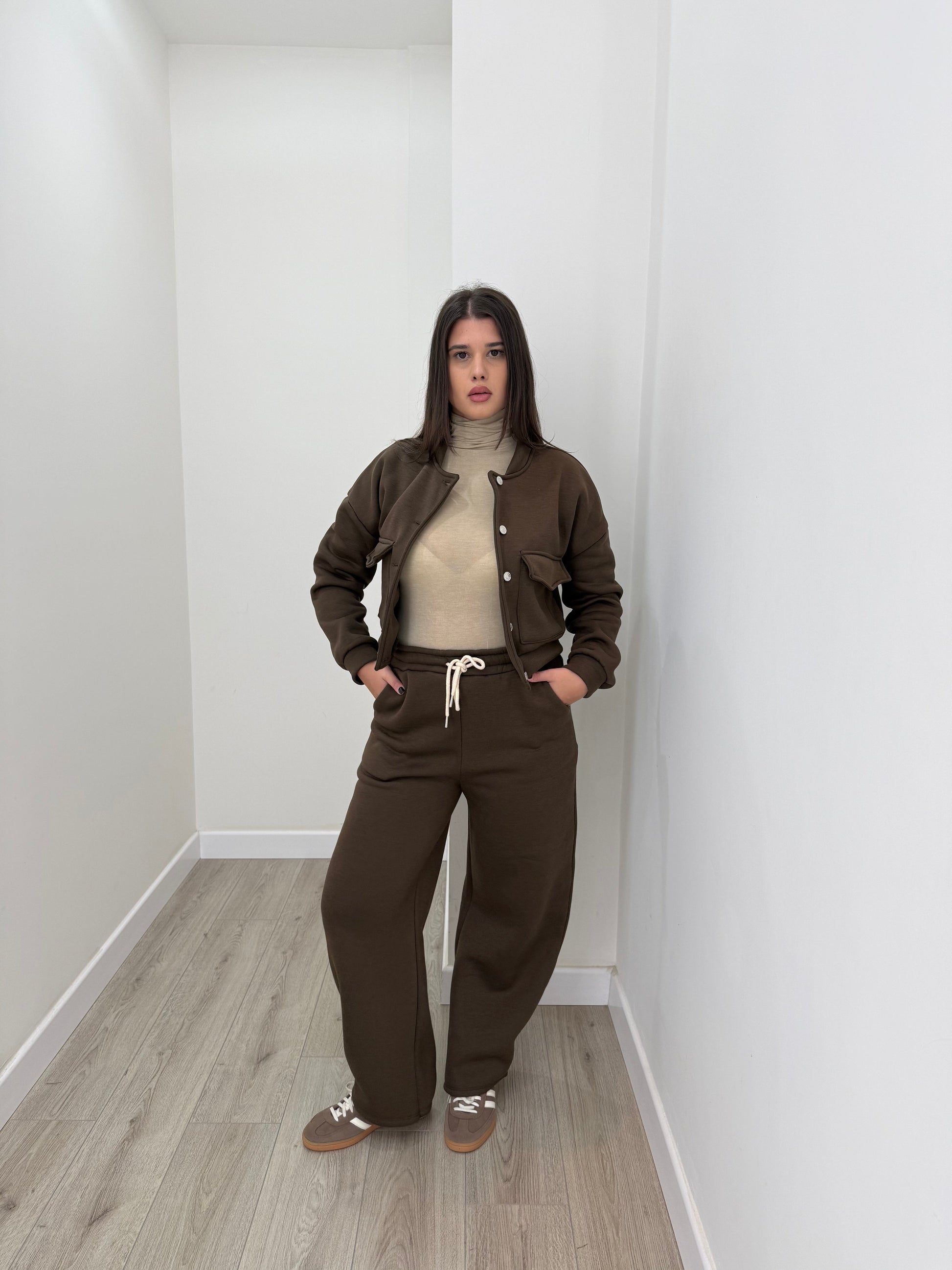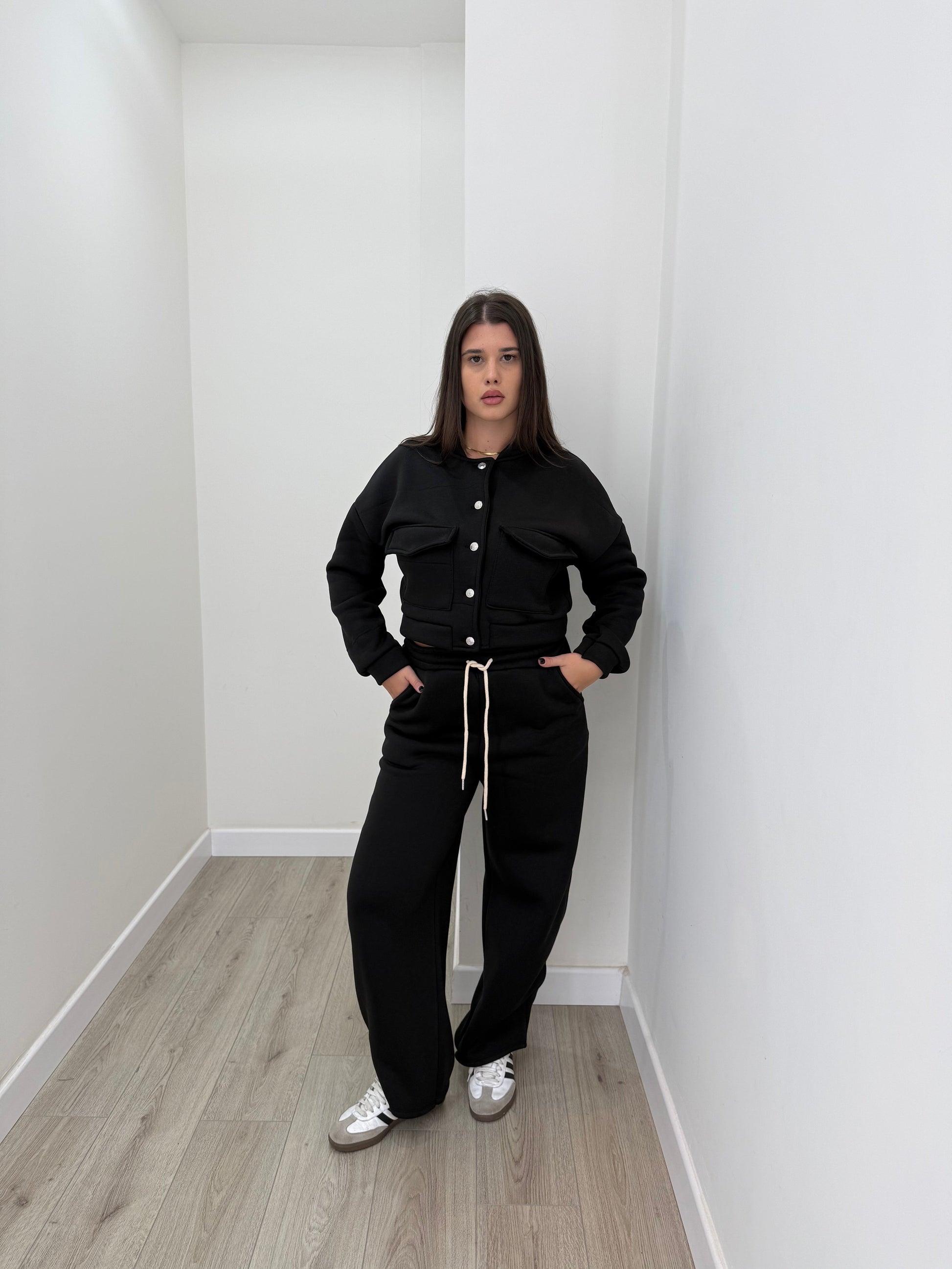 Coordinato tuta felpato sia il pantalone che la giacca. Il pantalone presenta l’elastico e laccio in vita, effetto ballon. Veste fino ad una XL