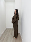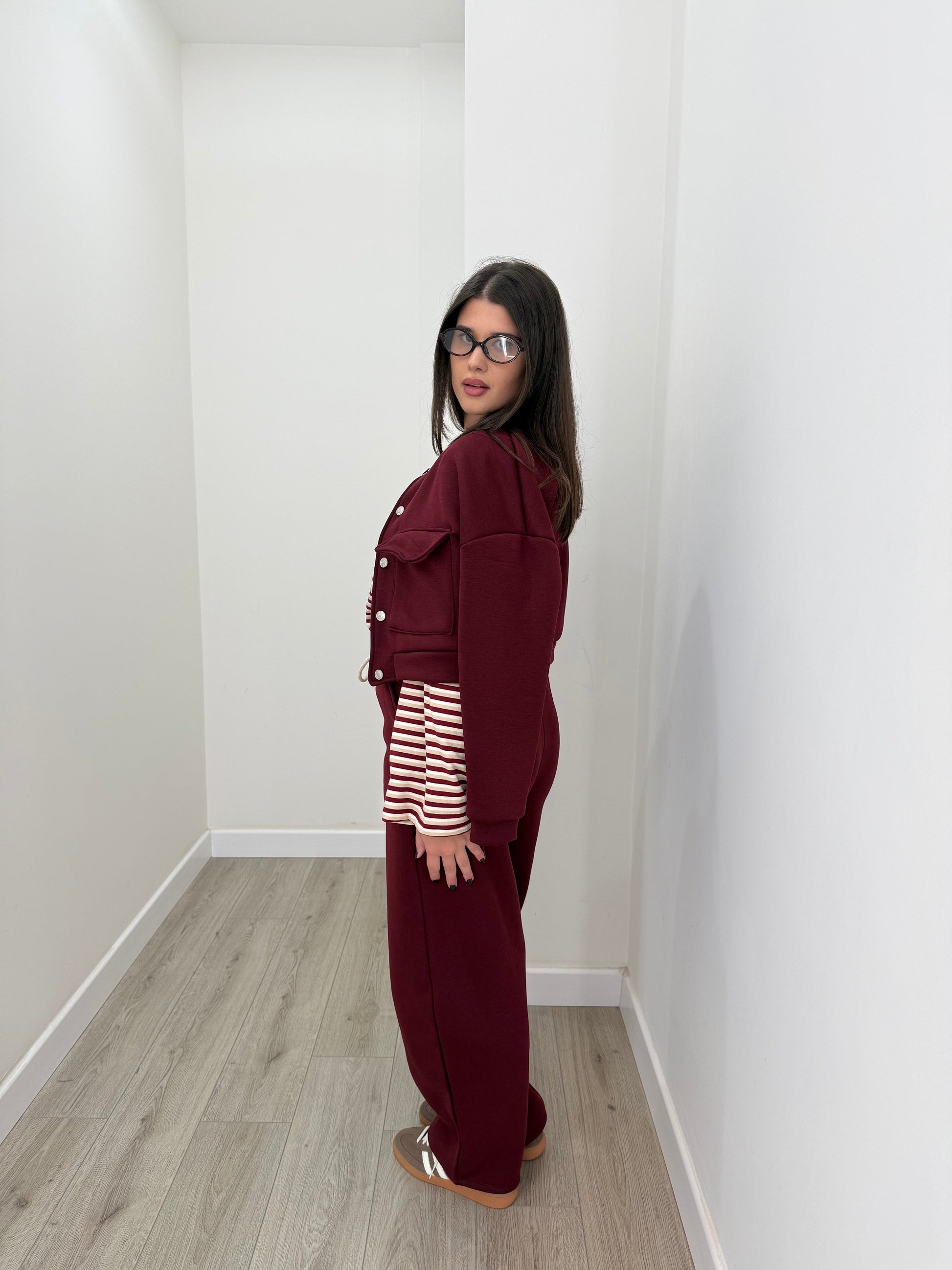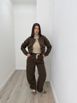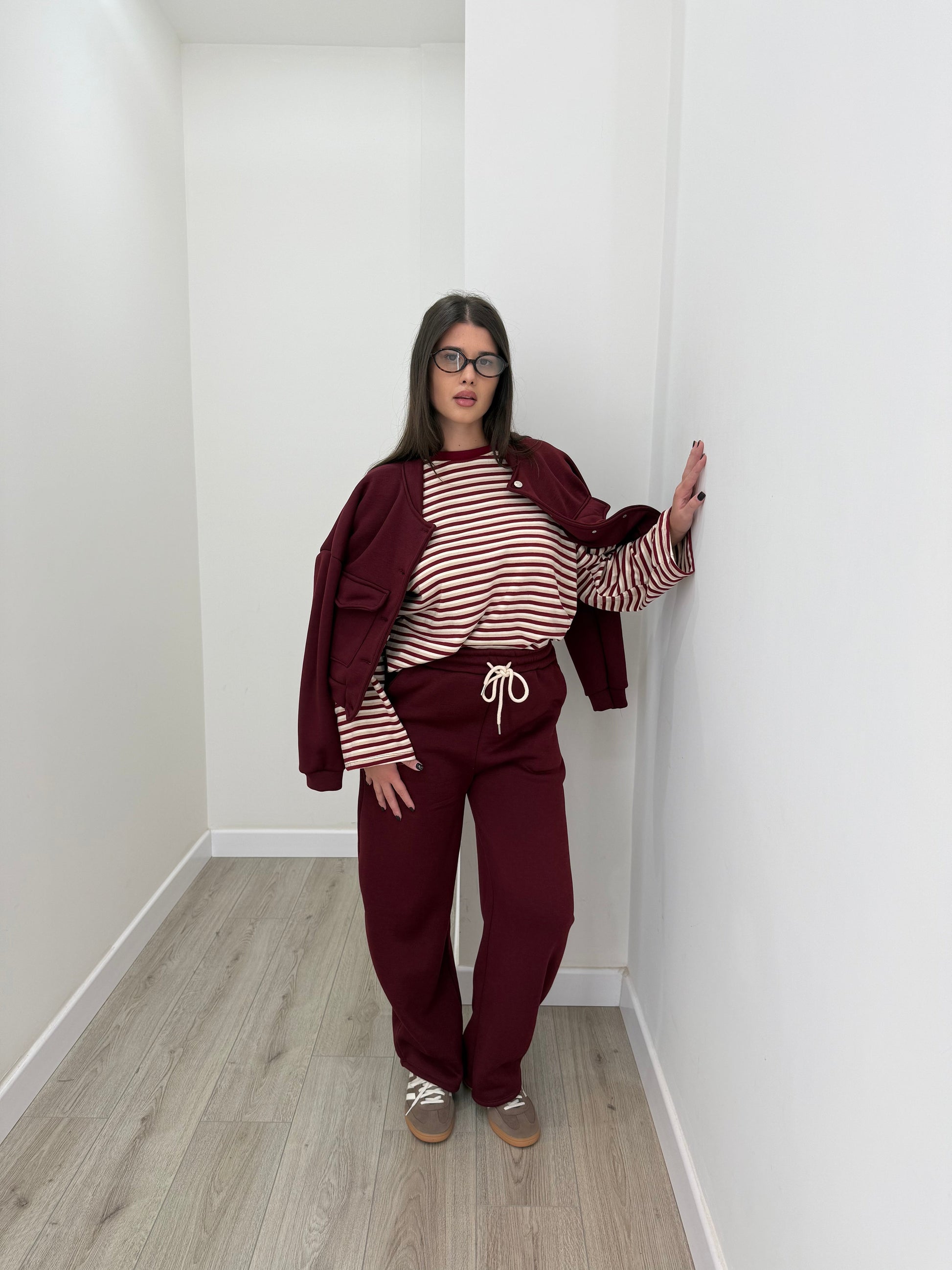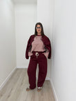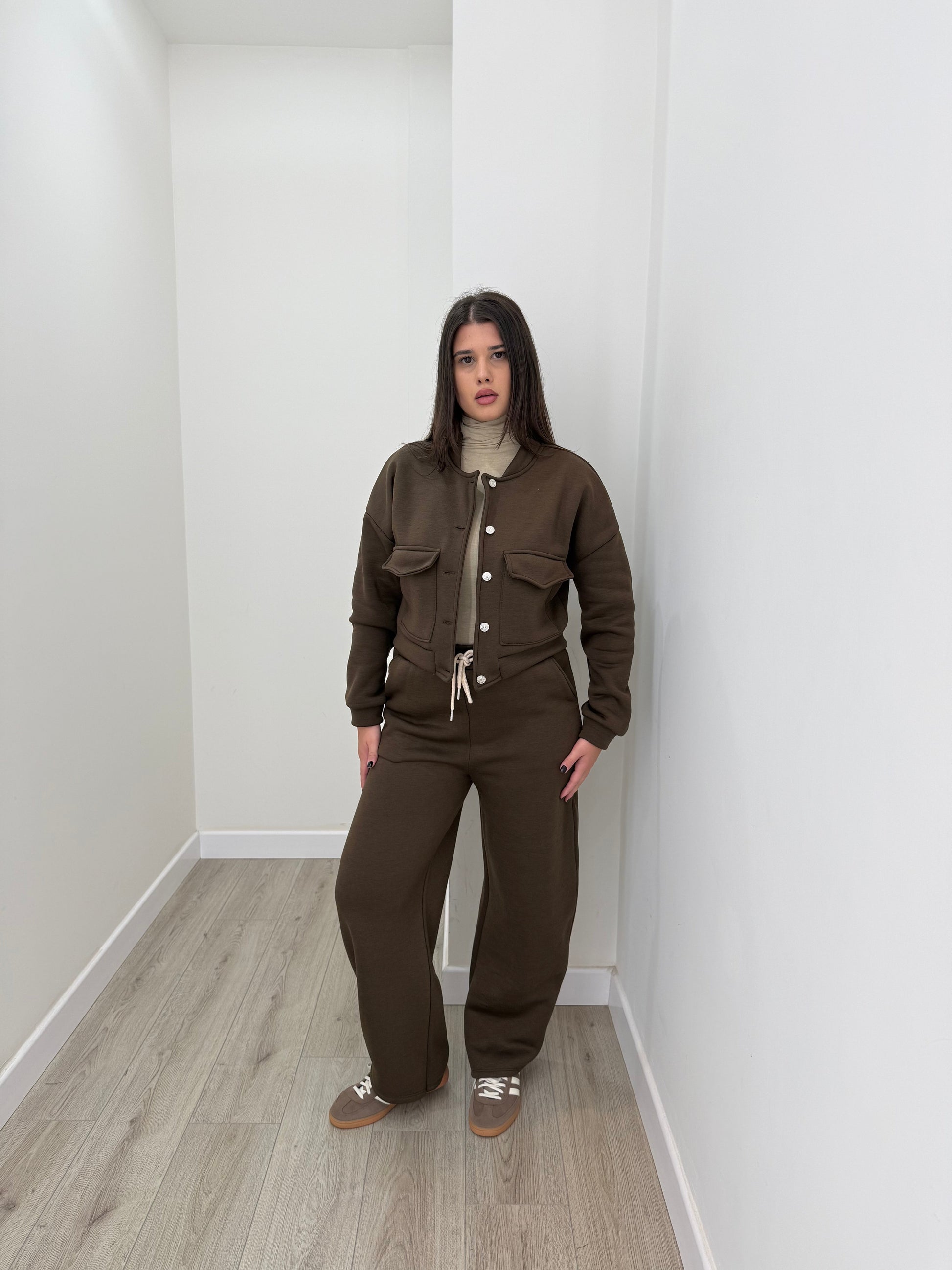 Coordinato tuta felpato sia il pantalone che la giacca. Il pantalone presenta l’elastico e laccio in vita, effetto ballon. Veste fino ad una XL